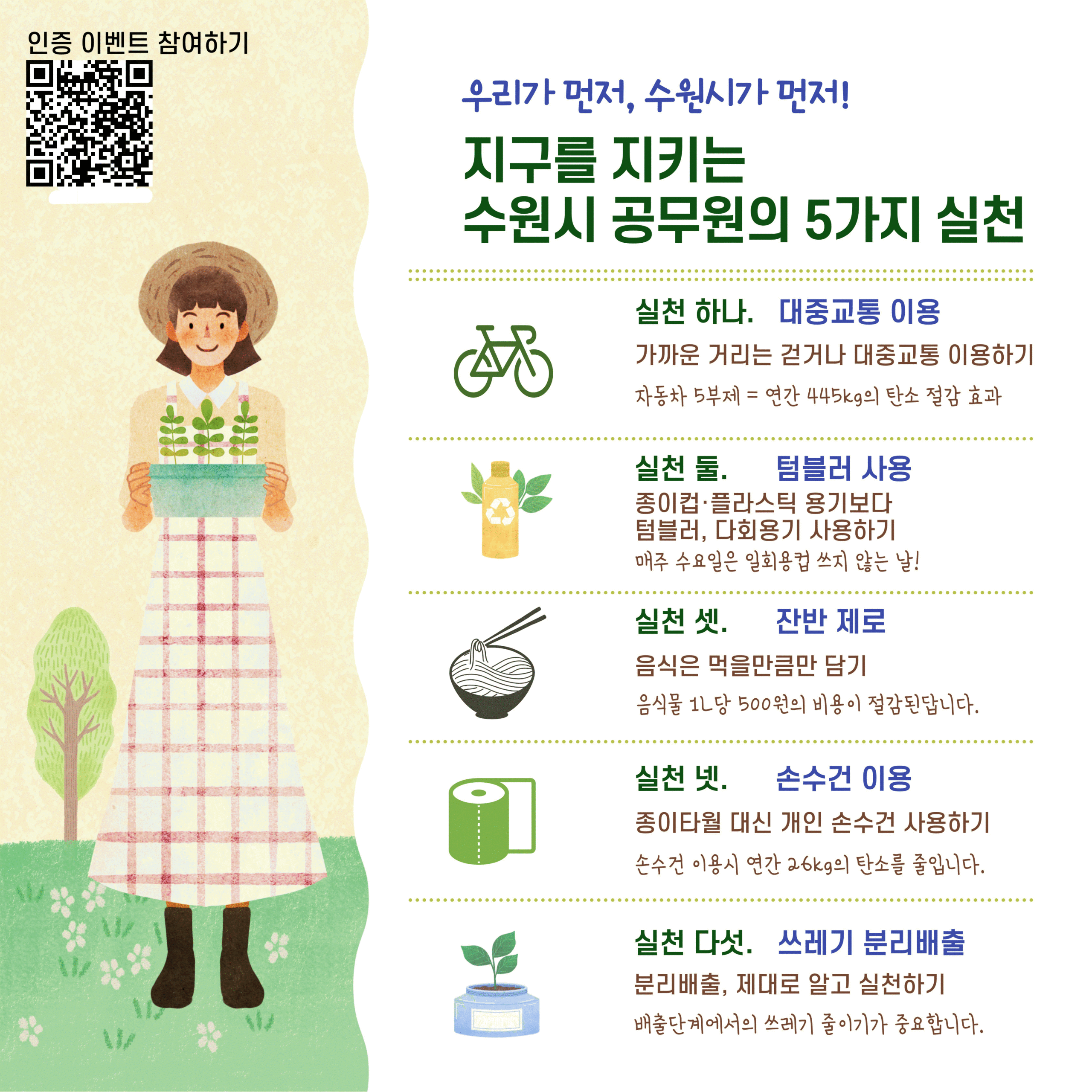 캠페인은 ‘가까운 거리는 걷거나 대중교통 이용하기’, ‘종이컵 대신 텀블러 사용하기’, ‘음식은 먹을 만큼만 담기’, ‘종이 타월 대신 손수건 사용하기’, ‘쓰레기 분리수거 철저히 하기’ 등 다섯 가지 실천을 중심으로 이뤄진다. 9월 한 달간 진행되며, 수원시 전 직원이 참여합니다.