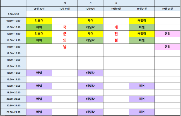 건강교육생활스포츠 9월30일부터~10월5일까지 수업기간표!! By 여정은 기자 - 2024년 9월 28일 0 34 Facebook Twitter Pinterest WhatsApp 10월1일 국군의날 과 10월3일 개천절 공휴일입니다. 참고하세여. 쉬는날이 많아서 10월달에는 운동 열심히 샤인핏필라테스와 함께해요~