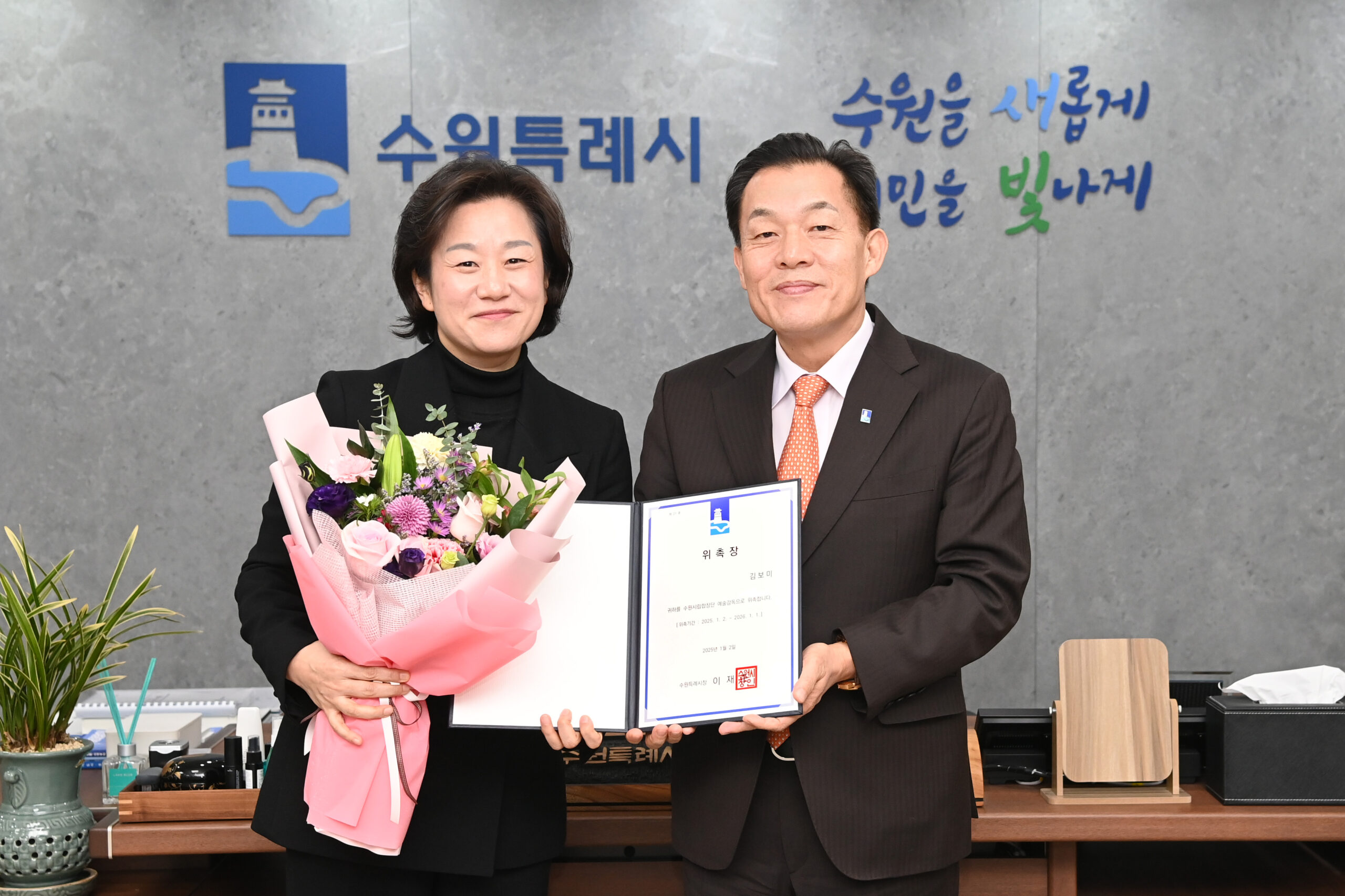 수원시(시장 이재준)가 수원시립합창단 제6대 예술감독으로 김보미 연세대학교 음악대학 교수를 위촉했다. 이재준 수원시장은 3일 집무실에서 김보미 예술감독에 위촉장을 수여했습니다.