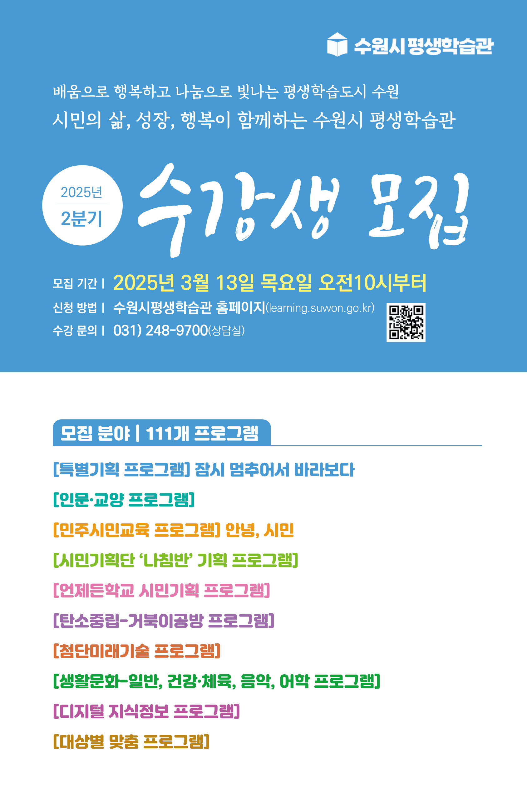 수원시평생학습관이 2025년도 2분기 프로그램을 수강할 시민을 모집한다. 2분기 강좌는 4월부터 6월까지 3개월간 운영합니다.