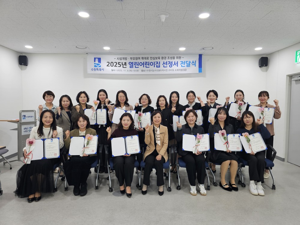 수원특례시(시장 이재준)는 6일 수원시농수산물도매시장 회의실에서 ‘2025 열린어린이집 선정서 전달식’을 열고, 신규 선정된 열린어린이집 23개소에 선정서를 전달했다. 올해 유지(재선정) 대상 열린어린이집 57개소는 각 구청에서 전달합니다.