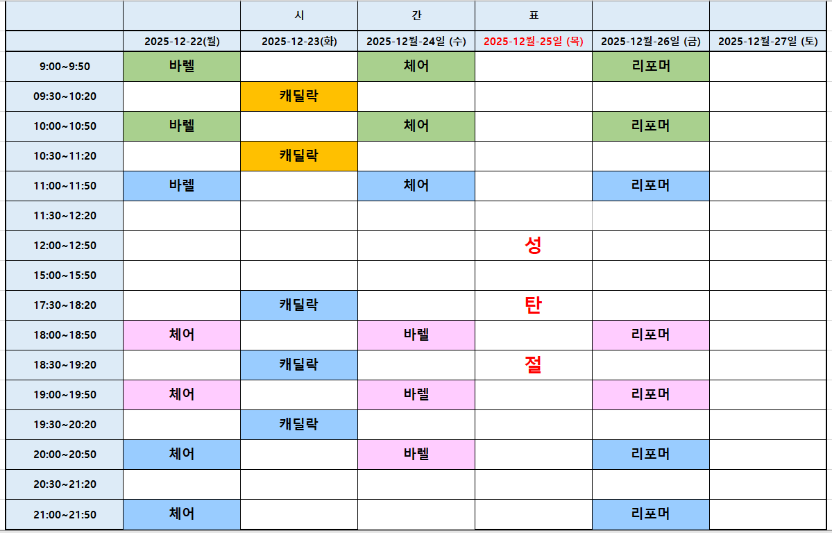 건강교육생활스포츠 12월22일부터~12월27일 수업시간표! By 여정은 기자 - 2025년 12월 22일 0 13 Facebook Twitter Pinterest WhatsApp 12월 25일은 휴강합니다~ 이번주는 토요일 수업이 없습니다!! 12월도 다 끝나가네요. 내년 여름을 지금부터라도 준비하세요~ 멋진바디를 만들기 위해서 샤인핏 필라테스가 함께 합니다~